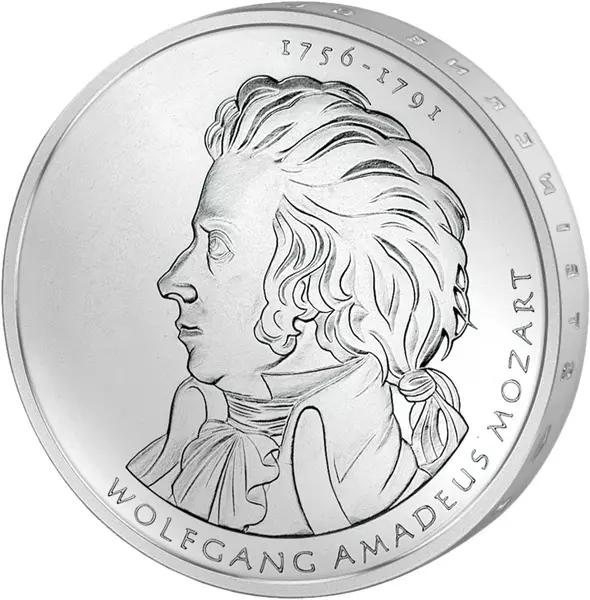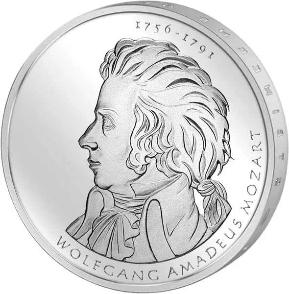 | Avers: | Porträtdarstellung Mozart nach links, Lebensdaten 1759-1791, Umschrift Wolfgang Amadeus Mozart |