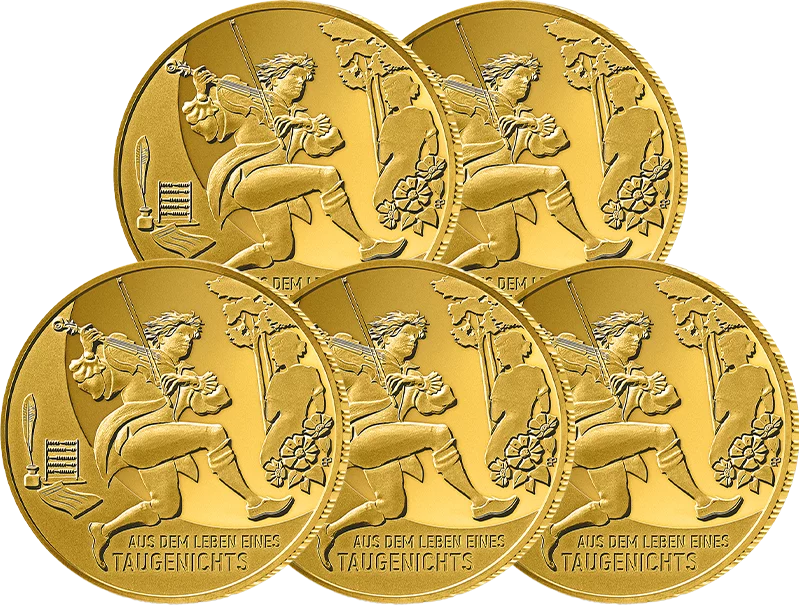 Im Jahr 2025 begeistert das Bundesfinanzministerium mit der dritten Ausgabe der Goldserie „Meisterwerke der deutschen Literatur“. Die 100-Euro-Münze kleidet Joseph von Eichendorffs Novelle „Aus dem Leben eines Taugenichts“ in ein numismatisches Gewand – detailreich, kunstvoll und enorm kostbar!