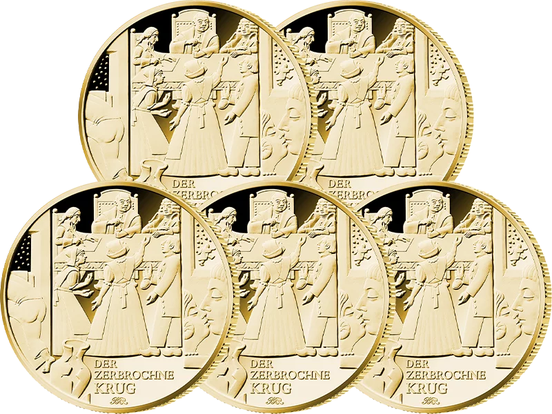Mit der hochwertigen Goldserie „Meisterwerke der Deutschen Literatur“ würdigt die Bundesrepublik Deutschland die bedeutendsten Werke der deutschen Literatur. „Der zerbrochne Krug“ ist die zweite Ausgabe. Die Münze aus 1/2 Unze reinem Gold wurde vom Künstler Bodo Broschat aus Berlin gestaltet und stellt den Inhalt des Werkes ausdrucksstark in Szene. Die Münze in bester Stempelglanz-Qualität ist eine hochwertige Gold-Anlage und gleichzeitig als Teil der Serie ein sehr interessantes Sammlerstück. Der Tag der Erstausgabe ist für den 7. Oktober 2024 vorgesehen, die Auflage ist auf maximal 90.000 Exemplare streng limitiert. Reservieren Sie schon heute Ihr Exemplar aus einer Prägestätte unserer Wahl! Unbedingt sichern!