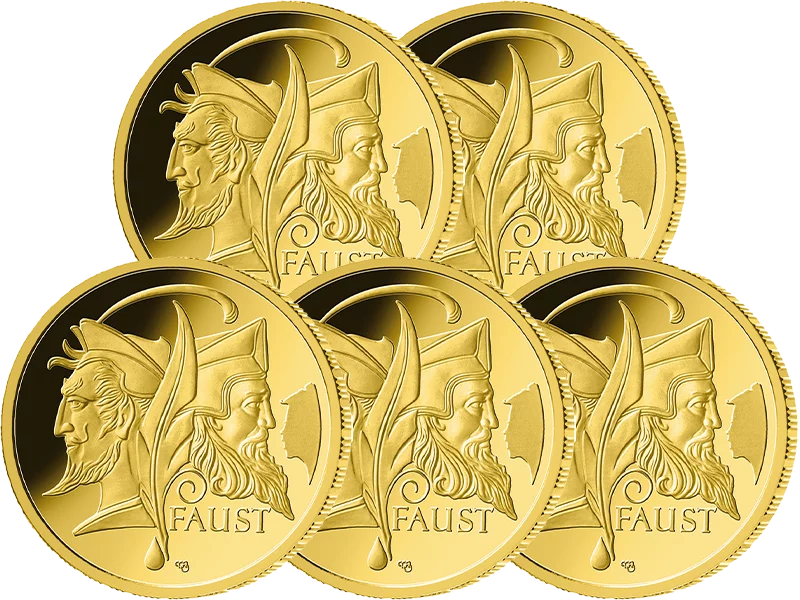 "Meisterwerke der deutschen Literatur" heißt die neue achtteilige Goldmünzenserie, die die Bundesregierung in den kommenden Jahren ausgeben wird. Den Start der Serie macht Goethes "Faust". Die Geschichte um den Gelehrten Heinrich Faust, der, unzufrieden mit seinem Leben, einen Pakt mit dem Teufel Mephistopheles eingeht.