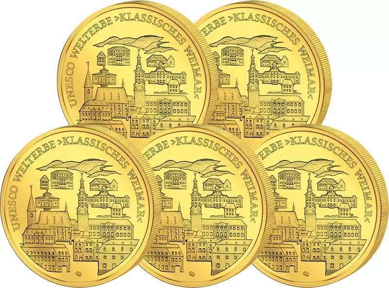 Auch 2006 gab es wieder mehr Interessenten als verfügbare Exemplare: Der deutsche Gold-Euro "UNESCO-Weltkulturerbe - Weimar" war schon am Tag der Ausgabe ausverkauft. Seitdem ist der Preis kräftig gestiegen, während die Auflage der Gold-Euros vom Deutschen Bundestag per Gesetz streng limitiert wurde. Jene Münz-Rarität aus 1/2 Unze reinstem .999 Gold besticht durch ihr detailreiches Motiv in bester Stempelglanz-Qualität und verfügt über ein enormes Wertepotenzial. Greifen Sie daher gleich zu und holen Sie sich die neueste 100-Euro-Münze der erfolgreichen UNESCO-Serie der BRD in Ihr Zuhause!