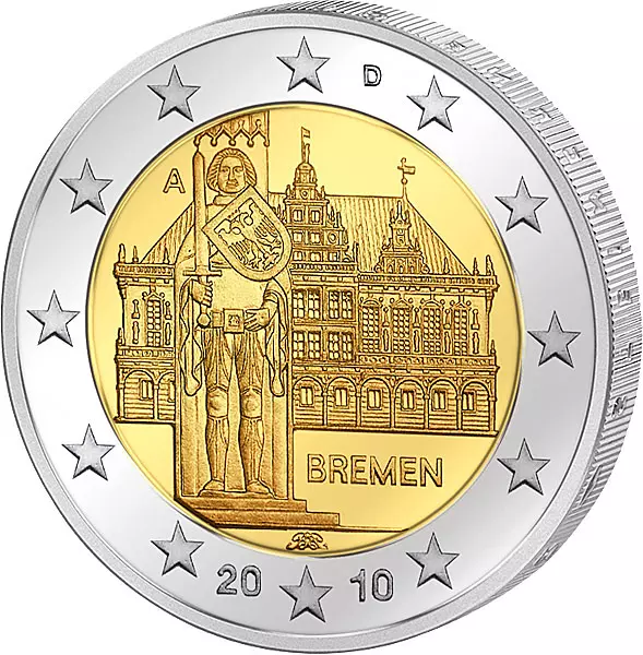 Die Bundesrepublik ehrt in einer Serie von 2-Euro-Gedenkmünzen seine Bundesländer; pro Jahr erscheint eine Ausgabe. Diese Münze aus dem Jahre 2010 ist der altehrwürdigen Hansestadt Bremen gewidmet und zeigt als Motiv die historische Rolandstatue und das prachtvolle Rathaus. Das über 600 Jahre alte Gebäude ist weltweit einzigartig und wurde von der UNESCO gemeinsam mit der Rolandstatue zum Weltkulturerbe der Menschheit erklärt. Das mächtige Denkmal aus dem 15. Jahrhundert ist die größte freistehende Plastik des deutschen Mittelalters.