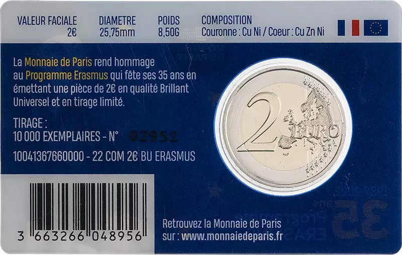 Zum 35-jährigen Bestehen dieses europäischen Leuchtturm-Projektes wurde nun eine motivgleiche 2-Euro Gedenkmünze der Euro-Länder angeregt. Das Bildmotiv, gestaltet von Joaquin Jimenez, einem bekannten französischen Graveur, zeigt eine Mischung aus den zwei Hauptelementen des Erasmus-Programms: der ursprünglichen intellektuellen Inspiration, Erasmus selbst, und der Allegorie seines Einflusses auf Europa. Die 2-Euro-Gedenkmünze aus Frankreich wird in prägefrischer Ausgabequalität in offizieller Coincard geliefert. Unbedingt zu empfehlen!