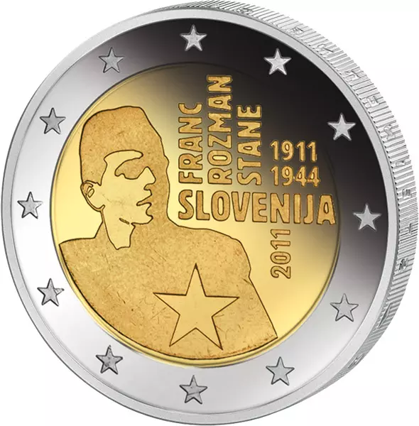| Avers: | Bildnis von Franc Rozman; Jahreszahlen: 1911 / 1944; Landesname: Slovenija; zwölf Sterne; Ausgabejahr: 2011 |